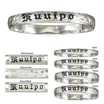 14K White Gold Custom Hawaiian Bangle Bracelet with Diamond Plumeria. There are two 0.03ct diamonds set in the center of each plumeria flower. Hand carved in Hawaii with Aloha. 1.25mm in thickness. We will engrave up to 20 letters on the bracelet.