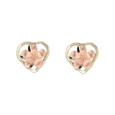14kt Two Tone Gold Plumeria Heart Pierced Earrings. These yellow gold Heart Earrings are 3/8" width and 1/2" length with 1/4" Rose Gold sand finished Plumeria flower in the center of the yellow gold heart. There are diamond cut on the edge of each petal.