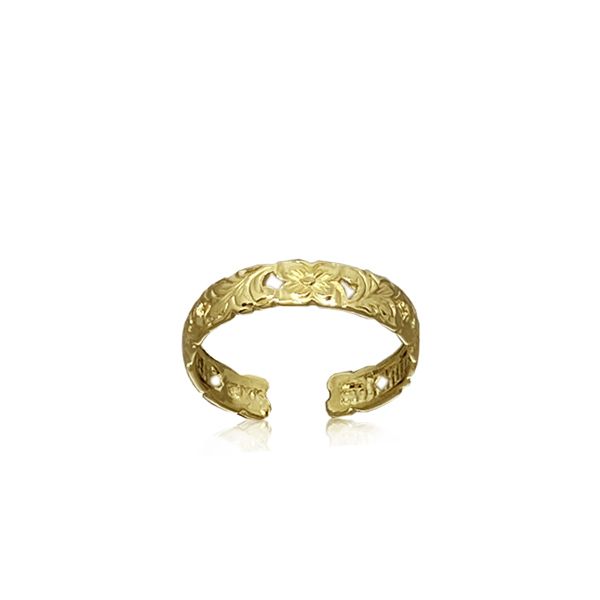 14kt Gold Hawaiian Cut-Out Plumeria Scroll Toe Ring. It is 1/8" wide and one size fits all.