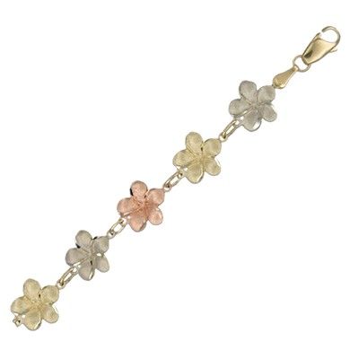 14kt Tri-Color Gold 10mm Plumeria Leis & Rope Bracelet. 3/8" in diameter with 11 Plumeria flowers on it. Each flower has hand-carved diamond cut on the petals. Each Plumeria flower is enclosed with a diamond cut rope. Total length is 7.25" and weight is over 8 grams. This bracelet has lobster clasp on it for extra safety.