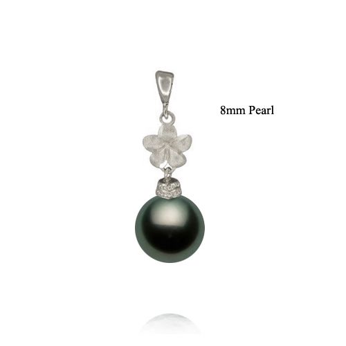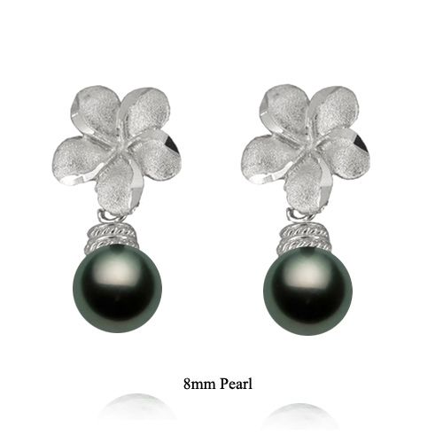 14KT White Gold 12mm Plumeria Tahitian Pearl Earrings. The Plumeria is 1/2 inch in diameter. Each petal on the Plumeria flower has sand finished and diamond cut on it. These beautiful earrings feature any kind of perfect round pearls, such as Tahitian blacks pearl.