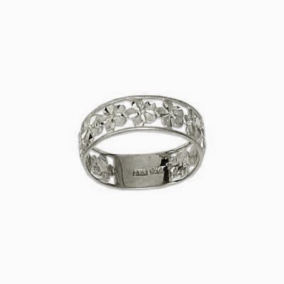 14kt White Gold 4mm Cut-In Hawaiian Plumeria with 6mm Ring Band. Each Hawaiian Plumeria Flower is 1/8" in diameter with brush finished and diamond cut on each petal. Size 5-10 are available.