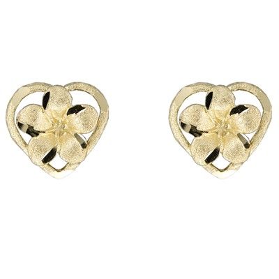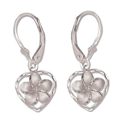 14kt White Gold Plumeria Heart Pierced Earrings. These Heart Earrings are 3/8" in width and 1/2" in length with 1/4" sand finished Plumeria flower in the center of the white gold heart. There are diamond cut on the edge of each petal.