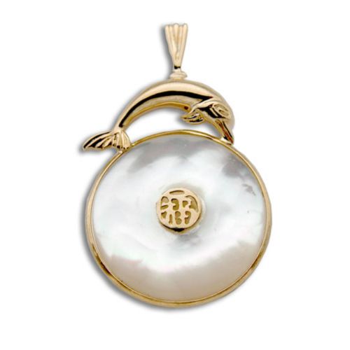 14KT Yellow Gold Dolphin with Good Fortune Symbol and Doughnut Shaped MOP (Mother of Pearl Shell) Pendant. This lucky pendant is 7/8 inches in diameter with round shaped MOP (Mother of Pearl Shell). The pendant is decorated with a 14KT Yellow Gold Dolphin and a 14KT Yellow Gold Chinese character "Good Fortune" on the center of the MOP. The total length is 1 3/8 inches.