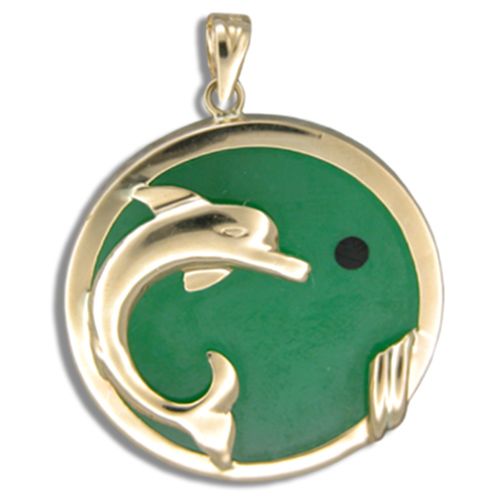 14KT Yellow Gold Dolphin with Round Shaped Green Jade Pendant