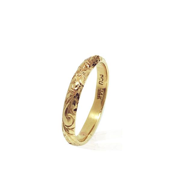 14KT Yellow Gold Hawaiian Wedding Ring. The ring band is 3mm in width and engraved with Plumeria and Scroll designs on it. Custom hand made in Hawaii with LOVE and ALOHA.