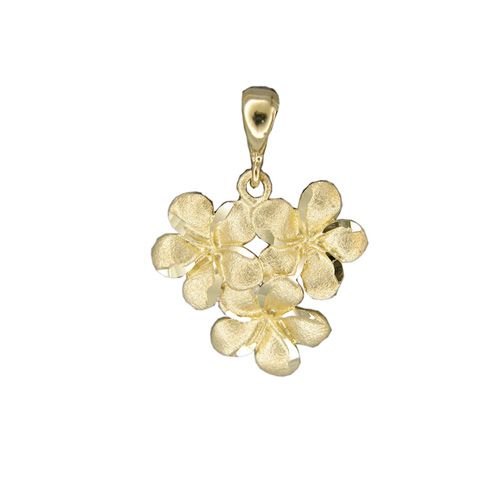 14kt Yellow Gold Triple Hawaiian Plumeria Flowers Ring (L). All three flowers are sand finished and diamond cut on the edges of each petal. The center flower is 1/2" in diameter and the other two flowers are 3/8" in diameter and set on the both side of the ring. Size 5-9 are available.
