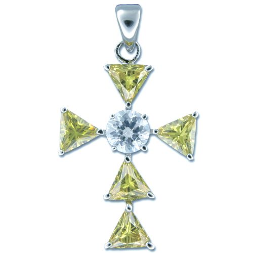 Sterling Silver Cross Design with Light Green CZ and Clear CZ Pendant