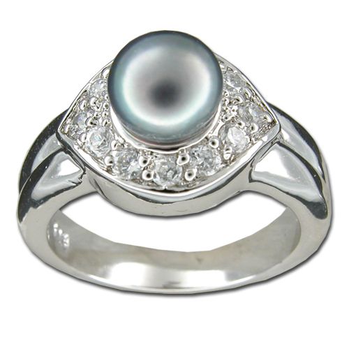 Sterling Silver Eye-Shaped Clear CZ with Fresh Water Pearl Ring