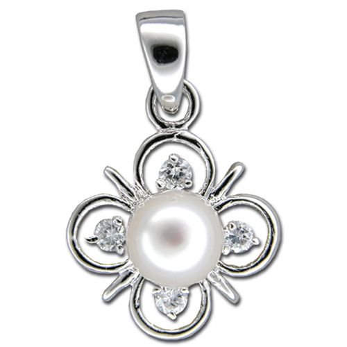 Sterling Silver Fresh Water Pearl on 4 Petals Flower with CZ Pendant