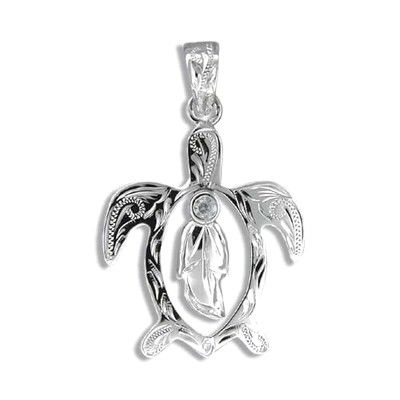 Hand Engraved Fine Sterling Silver Cut-Out Honu with Dangling Maile Leaf Pendant. The cut-out Honu shaped pendant is engraved with Hawaiian Scroll design and finished with Rhodium. The Bale is engraved with Hawaiian Scroll design, too. The dangling Maile Leaf shaped pendant is finished with Rhodium. There is a Clear CZ set in the center of the Maile leaf pendant. The pendant is coated with Rhodium to avoid tarnishing.