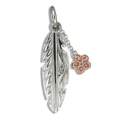 Hand Engraved Fine Sterling Silver Leaf and Plumeria Pendant. The 1 1/2" Rhodium finished Leave is engraved with Maile and Scroll designs. The dangling Plumeria flower has a Clear CZ in the center and plated with 14k Rose gold.