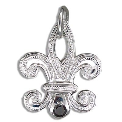 Fine Engraved Sterling Silver Men's Hawaiian FLEUR DE LIS Shaped with Black CZ Pendant