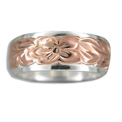 Hand Engraved Fine Sterling Silver Plumeria and Scroll Pendant. The 1 1/4" Rhodium finished pendant is engraved with Hawaiian scroll and plumeria designs, and is plated with 14kt Rose gold. The Bale is engraved with Hawaiian scroll design. The pendant is made with solid Sterling Silver and Rhodium finished to avoid tarnishing.