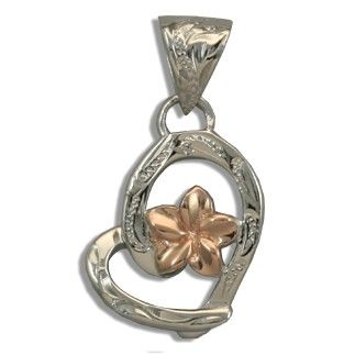 Fine Engraved Sterling Silver Rose Gold Coated Hawaiian Plumeria with Heart Shaped Pendant. The Rhodium Finished Heart shaped pendant is 1/2" in width, 5/8" in length and engraved with Hawaiian Scroll design. This pendant is plated with 14kt Rose Gold on the Hawaiian Plumeria design.