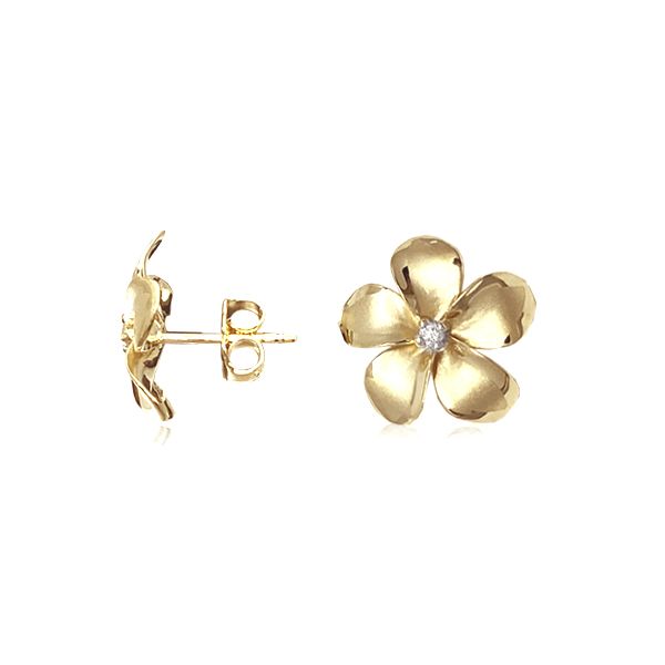14KT Gold Classic 14mm Plumeria Pierced Earrings with Diamonds