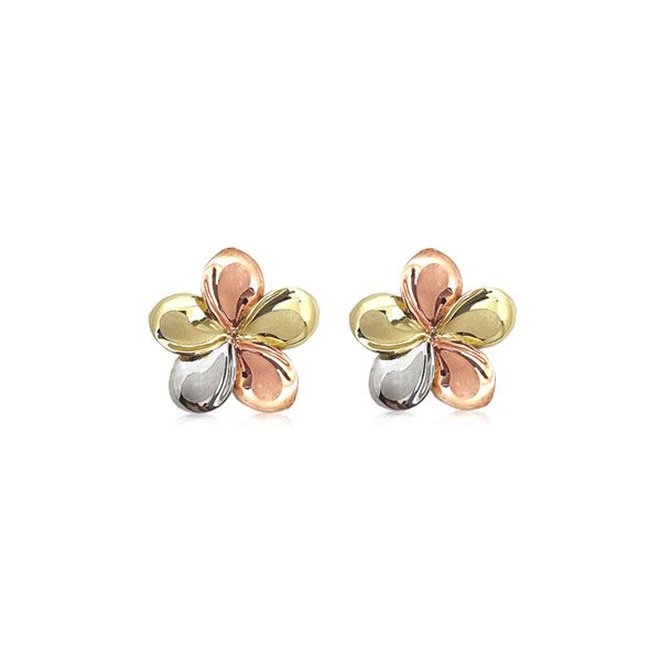 Hawaiian Island style Jewelry in 14KT Tri-color Gold. Handmade jewelry with the flavors of the Hawaiian islands, elements of the sea and mixed culture of the islands. Available in pendant, earrings, necklace, bracelet, anklet and ring. Each gold jewelry comes with Lifetime warranty and free shipping.Popular styles include Plumeria flower, Sea Turtle (Honu), pineapple, whale tail, dolphin, ray, palm tree, Hibiscus (state flower), bird of paradise, slipper, wave, fish hook and more. Each gold jewelry comes with Lifetime warranty and free shipping.