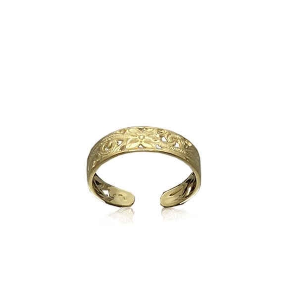 14kt Gold Hawaiian Cut-in Plumeria Scroll Toe Ring. It is 4mm (1/8") wide and one size fits all.