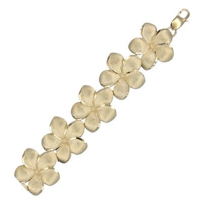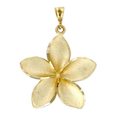 14kt Yellow Gold 18mm Plumeria Pierced Earrings. 3/4" in diameter and weight is over 4 grams. Each petal on the Plumeria flower has sand finished and diamond cut on it.