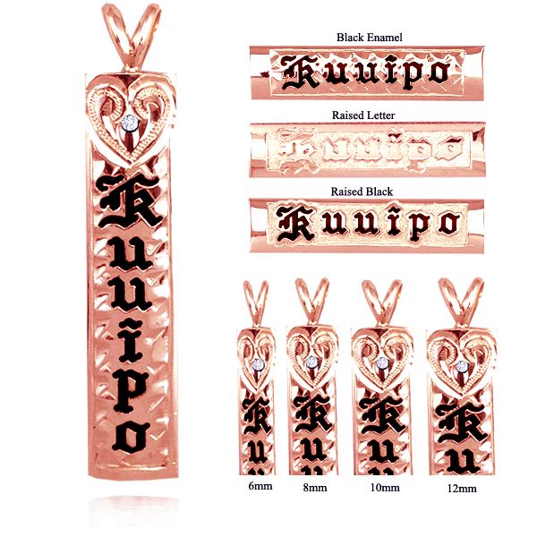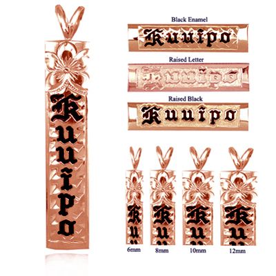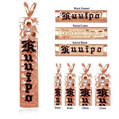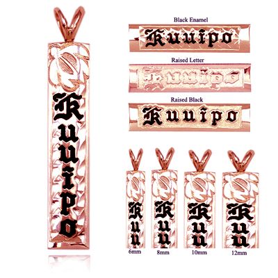 Each 14KT Solid Rose Gold Hawaiian Heirloom Vertical Pendant is hand crafted by our team of skilled Hawaiian jewelers in Hawaii and personalized with your name. Each personalized vertical pendant comes with lifetime warranty and free shipping. It usually takes 3 days to make and 5 days to ship from Honolulu, Hawaii to you.