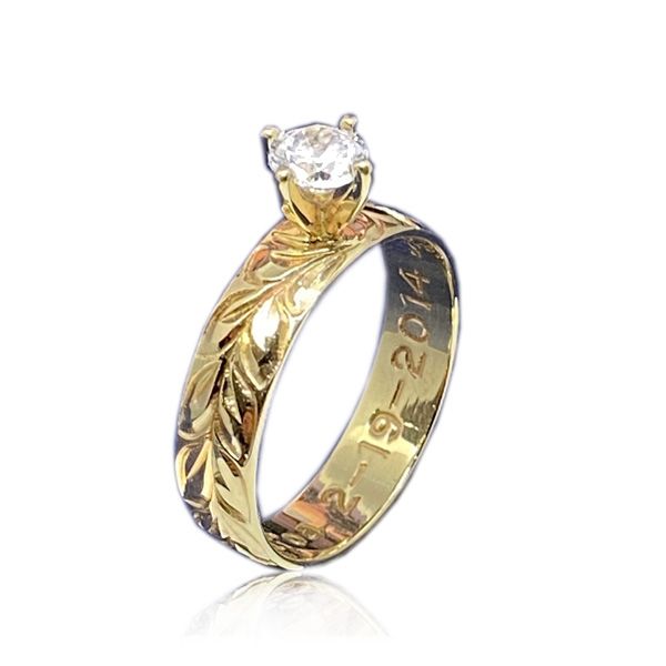 The Maile Hand carved ring band is 6mm ( 1/4 inches) with 1 carat round stone at your choice. Available in cubic zirconia (CZ), Moissanite, Lab Grown Diamond and H/I Color Genius Diamond.
