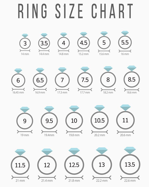 Then compare to the table below to find your ring size. In addition, if you are ordering a width ring band (10mm and 12mm), you may need to add 1/2 size to it.