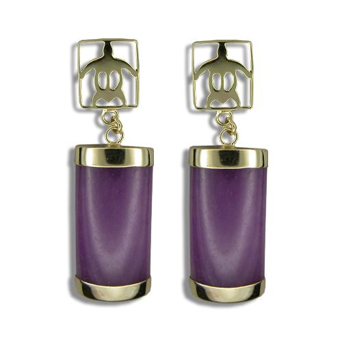 14KT Yellow Gold Honu with Long Bar Shaped Purple Jade Earrings. These earrings are made with 14kt yellow gold with long bar shaped purple jade. The purple jade is 5/16 in width and 3/4 in length. Total length is 1 1/8 inches.