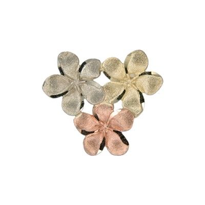 14kt Tri-color Gold Hawaiian 12MM Plumeria Blossom Slide Pendant. There are 3 different color 3/4" Plumeria flowers on it. Each flower is sand finished with diamond cut on the edge of each petal on the flower. 1" in width and 3/4" in length.