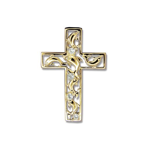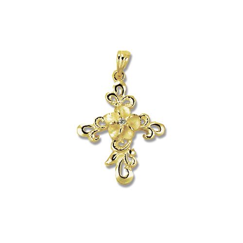 14kt Yellow Gold 6mm Plumeria Leis Cross with CZ Pendant