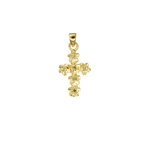 14kt Yellow Gold 6mm Plumeria Leis Cross with CZ Pendant. There are six 1/4" Plumeria flowers with cz on the cross. This pendant is 1/2" in width and 3/4" in length. Each flower has sand finished and diamond cut on the edges of each petal. Total length is 1".