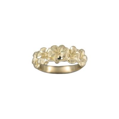 14kt Yellow Gold Plumeria Ring. There are five yellow color gold Plumeria flowers which are 1/4" in diameter on the ring. Yellow gold flowers have diamond cut on the edges of each flowers and sand finished.