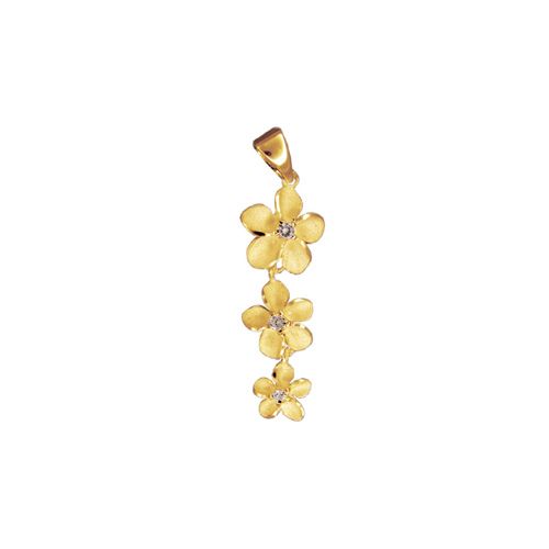 14kt Yellow Gold Past Present and Future Plumeria with CZ Pendant. The flowers are 5/16", 3/8" and 1/2" in diameter with hand carved sand finish with diamond cut on the edge of each petal. Diamond CZ is set in the center. Total length is 1 1/2" and weight is over 2 grams.