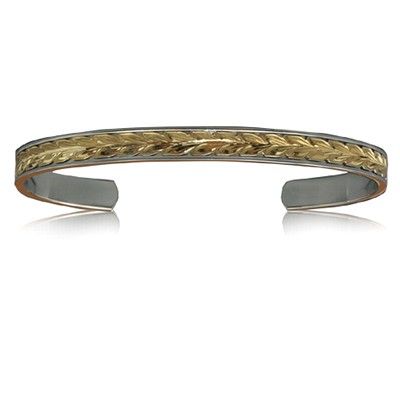 Sterling Silver Hawaiian 14K Yellow Two Tone Maile Cuff 8mm Bangle