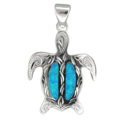 Sterling Silver Hawaiian Hand Carved Blue Opal Honu Pendant (L). This pendant is 1 1/16" in width and 1 3/8" in length with inlay Opal on the back of the sea turtle. Total length is 1 1/2". This pendant is made with sterling silver and finished with Rhodium to avoid tarnishing.