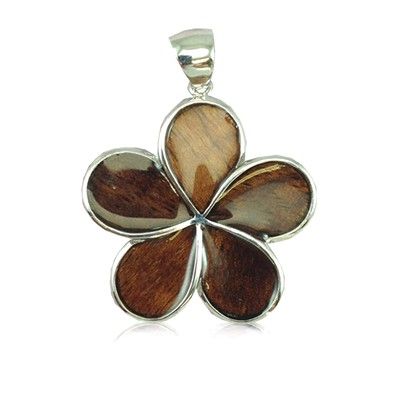 Sterling Silver Hawaiian Koa Wood 25MM Plumeria Design Pendant (L). The Plumeria pendant is 1" in diameter and total length is 1 5/16". The Plumeria Design with Hawaiian Koa Wood Inlay pendant is made with sterling silver and finished with Rhodium to avoid tarnishing.