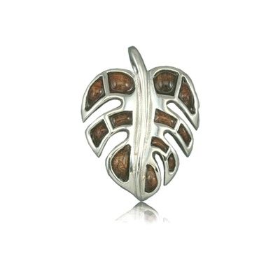 Sterling Silver Hawaiian Koa Wood Fancy Monstera Leaf Pendant. 18mm in width and 22mm in length with Hawaiian Koa Wood Inlay. This pendant is made with sterling silver and finished with Rhodium to avoid tarnishing.