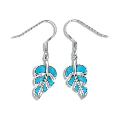 Sterling Silver Hawaiian Monstera Leaf with Blue Turquoise Fish Wire Earrings