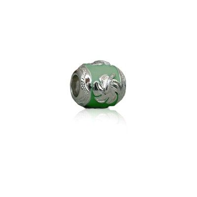 Sterling Silver Rhodium Green Enamel Hibiscus Bead. 8mm by 10mm. Hand carved with unique Hawaiian engraving. All beads are compatible with Pandora, Chamilia, Troll bead and Biagi bracelets.