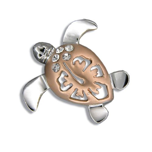 Sterling Silver Hawaiian Sea turtle Pendant with Hibiscus flower. This pendant has 14kt rose gold sand finish on the back of the shell and CZ. 5/8" x 5/8" in size.