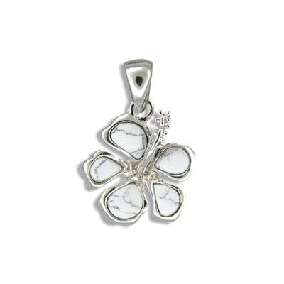 Sterling Silver Hawaiian Hibiscus with White Turquoise Pendant. 3/4" in diameter with White turquoise Inlay. Total length is 1". This sterling silver pendant is finished with Rhodium to avoid tarnishing. Very stunning, can be worn with anything. Always appropriate and gorgeous, this pendant is a timeless classic, and it belongs in every jewelry wardrobe.