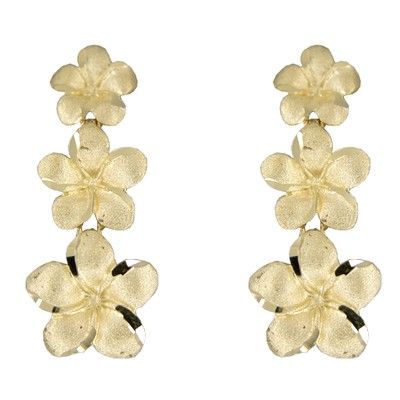 14kt Yellow Gold Triple Hawaiian Plumeria Dangling Earrings. There are three Plumeria flowers on each side. The 14kt yellow gold flowers are 5/16", 3/8", 1/2" in diameter and total length of all three flowers is about 1 1/8". All Plumeria flowers have diamond cut on each petal and sand finished.