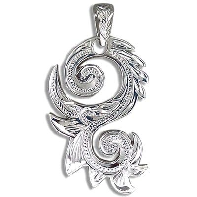 Fine Engraved Sterling Silver Fancy Men's Two Sided Hawaiian Scroll Pendant. The Rhodium Finished pendant is 7/8" in width, 1 5/16" in length and engraved with Hawaiian Scroll design. The pendant is coated with Rhodium to avoid tarnishing. Total length is 1 5/8".