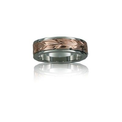 Maile Hawaii Brand - Sterling Silver Hawaiian 14kt Rose Two Tone Maile Ring Band. 6mm in width and 2mm in thickness with hand carved Maile leaves designs all around the ring. Available in size 5 to 10. This ring is finished with Rhodium to avoid tarnishing.