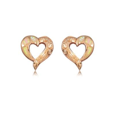 Sterling Silver Hawaiian Cut-Out Heart Rainbow Opal Pierced Earrings . These hand inlayed and polished heart earrings are 1/2" in diameter.