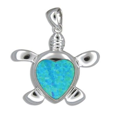 Sterling Silver Hawaiian Honu with Heart Shaped Blue Opal Pendant. 1 1/16" in width and 1" in length with Blue Opal Inlay. Total length is 1 1/4". This pendant is made with sterling silver and finished with Rhodium to avoid tarnishing.