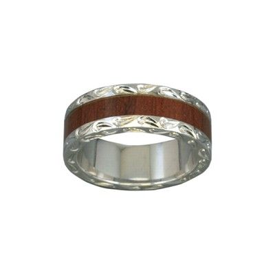 Sterling Silver Hawaiian Koa Wood Men's Eternity Ring. 7mm in width and 2mm in thickness. Weighted over 6 grams with hand carved Wave designs all around the ring. The Eternity Koa Wood is inlayed all around the ring as well. Size 3 to 12 are available. This ring is made with sterling silver and finished with Rhodium to avoid tarnishing.