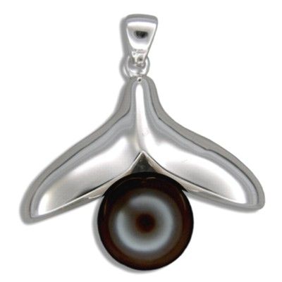 Sterling Silver Hawaiian Whale Tail with Black Shell Pearl Design Pendant (L). The Whale Tail pendant is 1 3/16' in width and 1 1/4' in length. Total length is 1 3/8' with a 1/2' Black Fresh Water Pearl. It is made with Sterling Silver and Rhodium finished to avoid tarnishing.