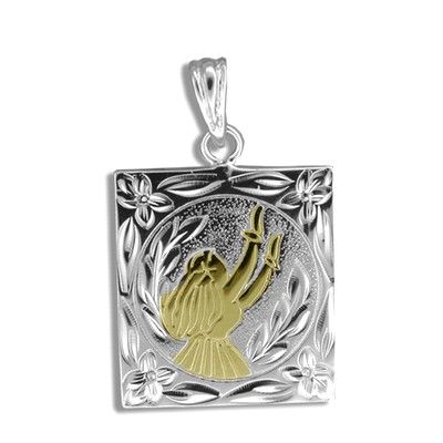 Kahiko Collection - Sterling Silver Yellow Gold Coated Kahiko Moon Light Hula Dancer Pendant. This pendant is 1" by 1" and finished with 14kt Yellow Gold. By mixing of traditional Hawaiian Hula Dancing themes and Hawaiian Jewelry engraving techniques, a unique Hula Jewelry collection was created. Kahiko Collection is made with solid Sterling silver and Rhodium finish to avoid tarnishing. In addition, Kahiko Collection has copyrighted authenticating trademark on the backside of each design. The trademark is laser engraved on every design permanently to guarantee originality.