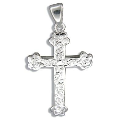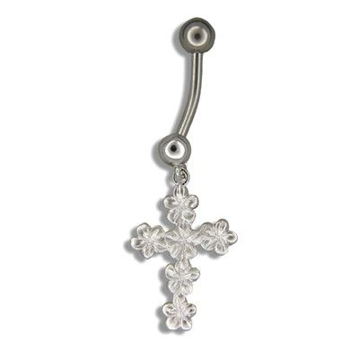 Sterling Silver Dangling Hawaiian Plumeria and Cross Shaped Belly Ring. There are 6 Plumeria flowers on the cross shaped pendant. The cross pendant is 5/8" width and 7/8" length. The bar is standard 14 Gauge 3/8" Length and 316L Surgical Stainless Steel Bar. This belly ring is made with sterling silver and finished with Rhodium to avoid tarnishing. Total length is 1 1/4".