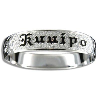 Sterling Silver 12mm Hawaiian Plumeria and Scroll Design with Raised Black Enamel 'Kuuipo' Bangle . 1/2" in width and average over 23g in weight. There are Hawaiian Plumeria and Scroll designs all around the bangle. There is a Raised Black Enamel Name 'Kuuipo' engraved on the center of the bangle and the edges are plain design.